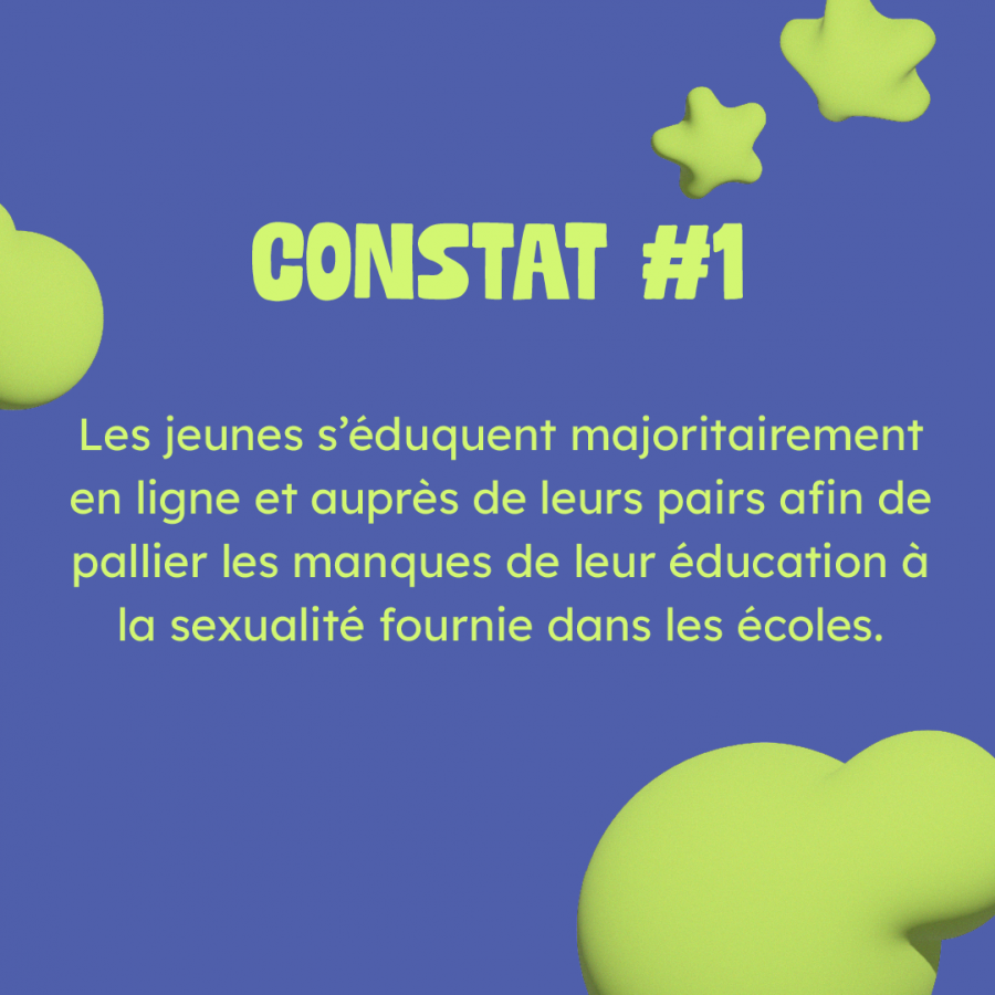 Cette thématique nous a permis de définir les besoins en éducation à la sexualité des jeunes, d’identifier leurs connaissances actuelles, de définir leurs sources d’information et le rôle des technologies numériques dans leur éducation à la sexualité, ainsi que d’identifier les thématiques manquantes dans les actuels contenus pédagogiques en éducation à la sexualité.